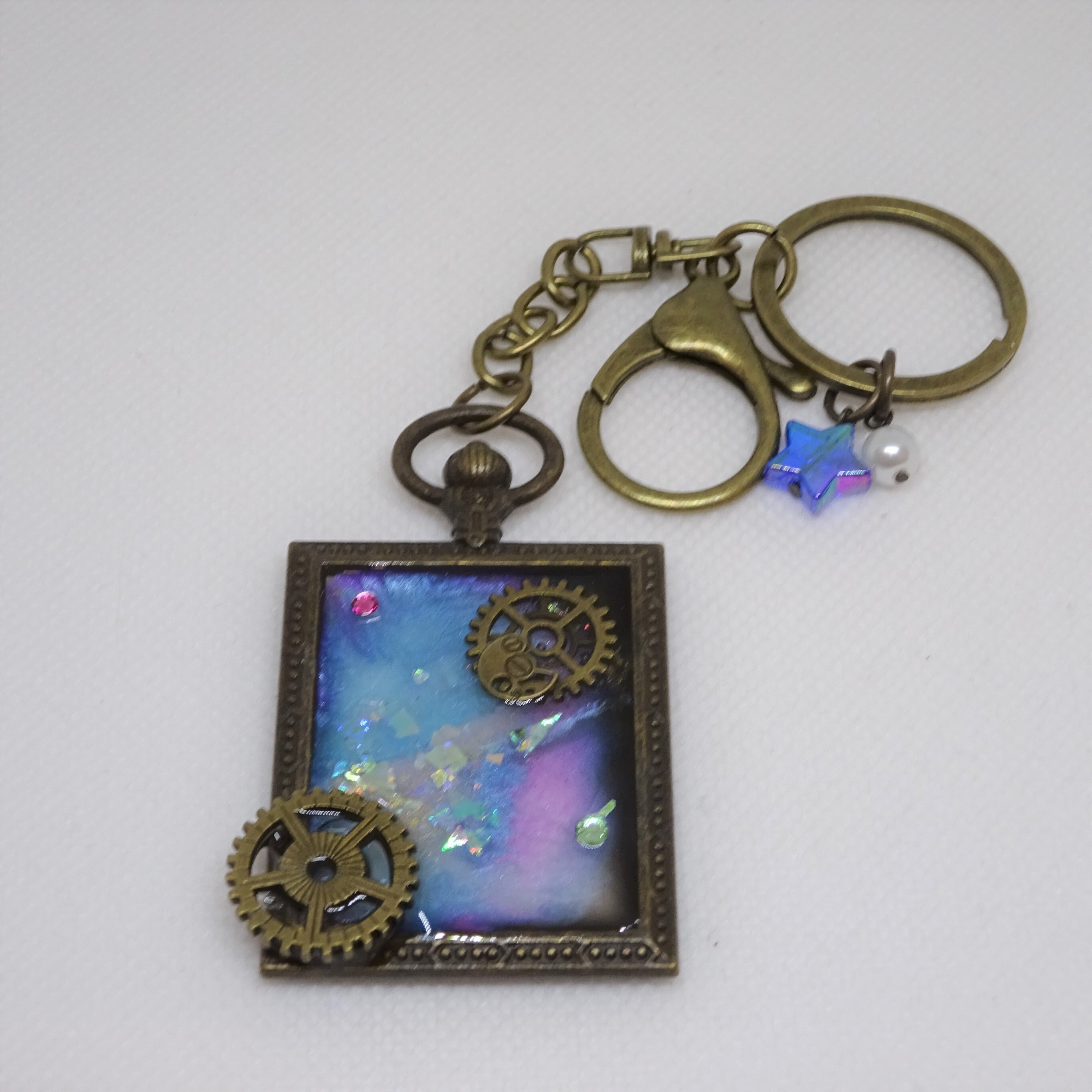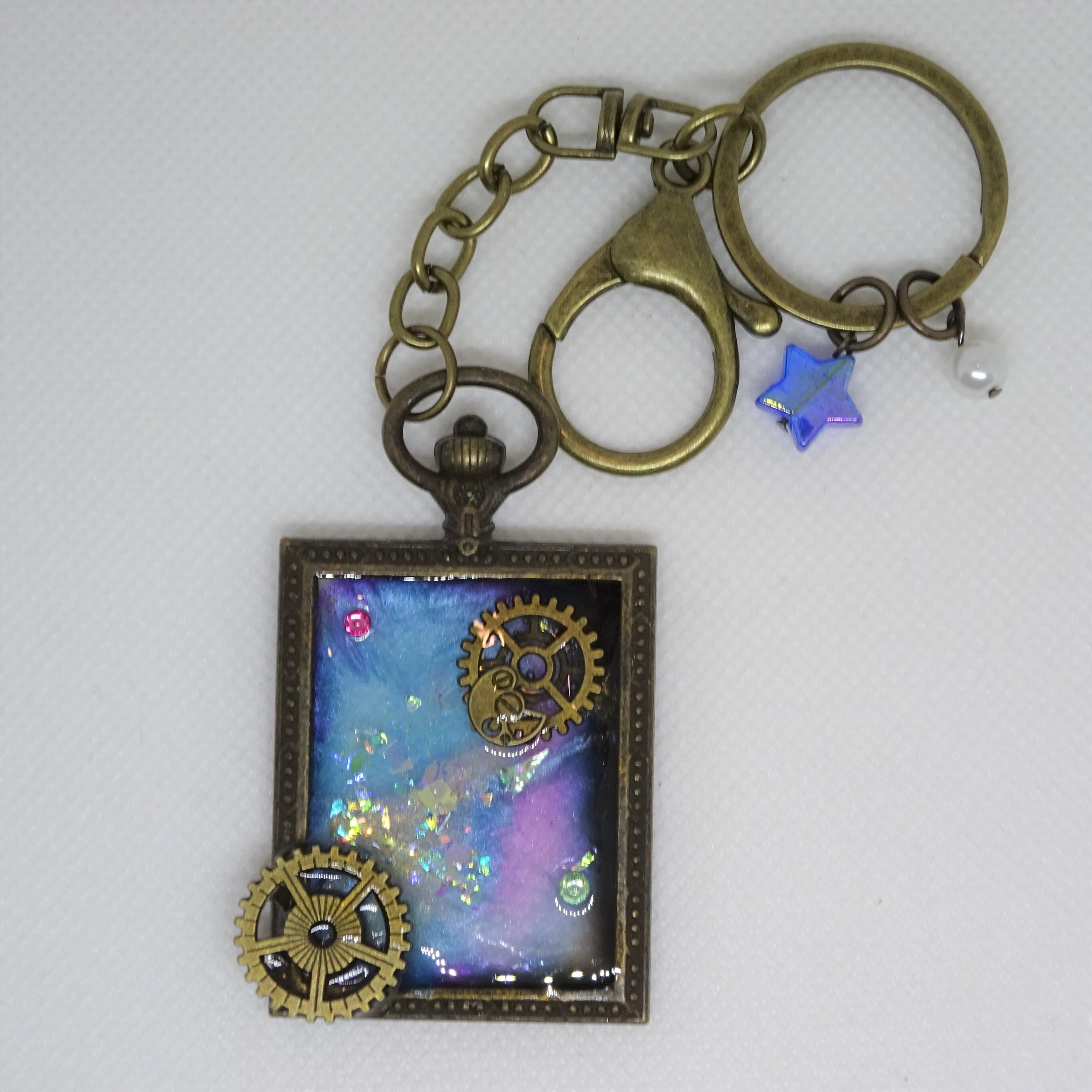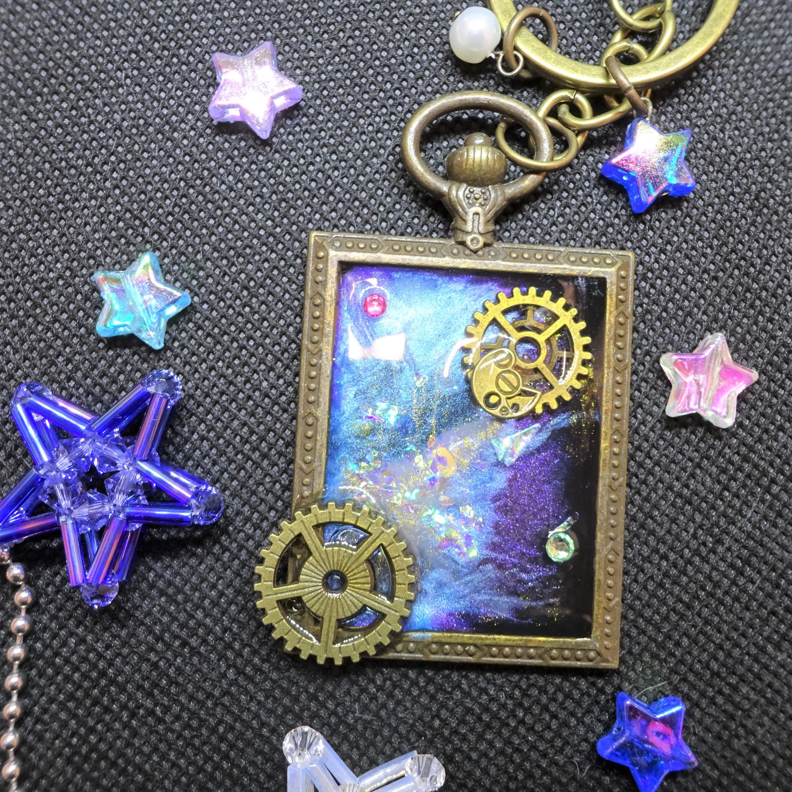 コスモパンクキーホルダー①[レジン/一点もの/キーホルダー/コスモ/宇宙/宇宙柄/スチームパンク/歯車/懐中時計風/長方形]