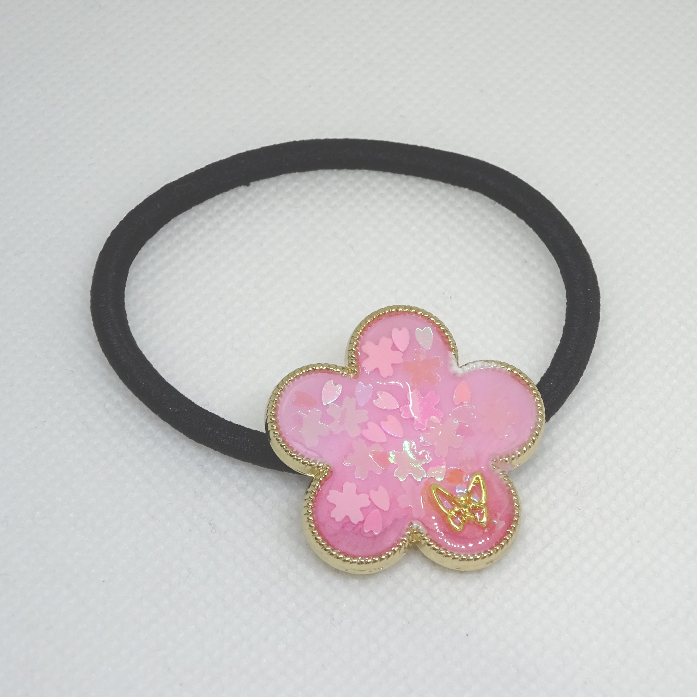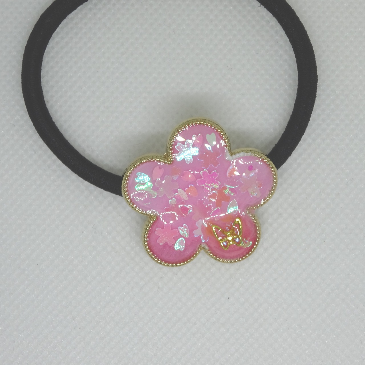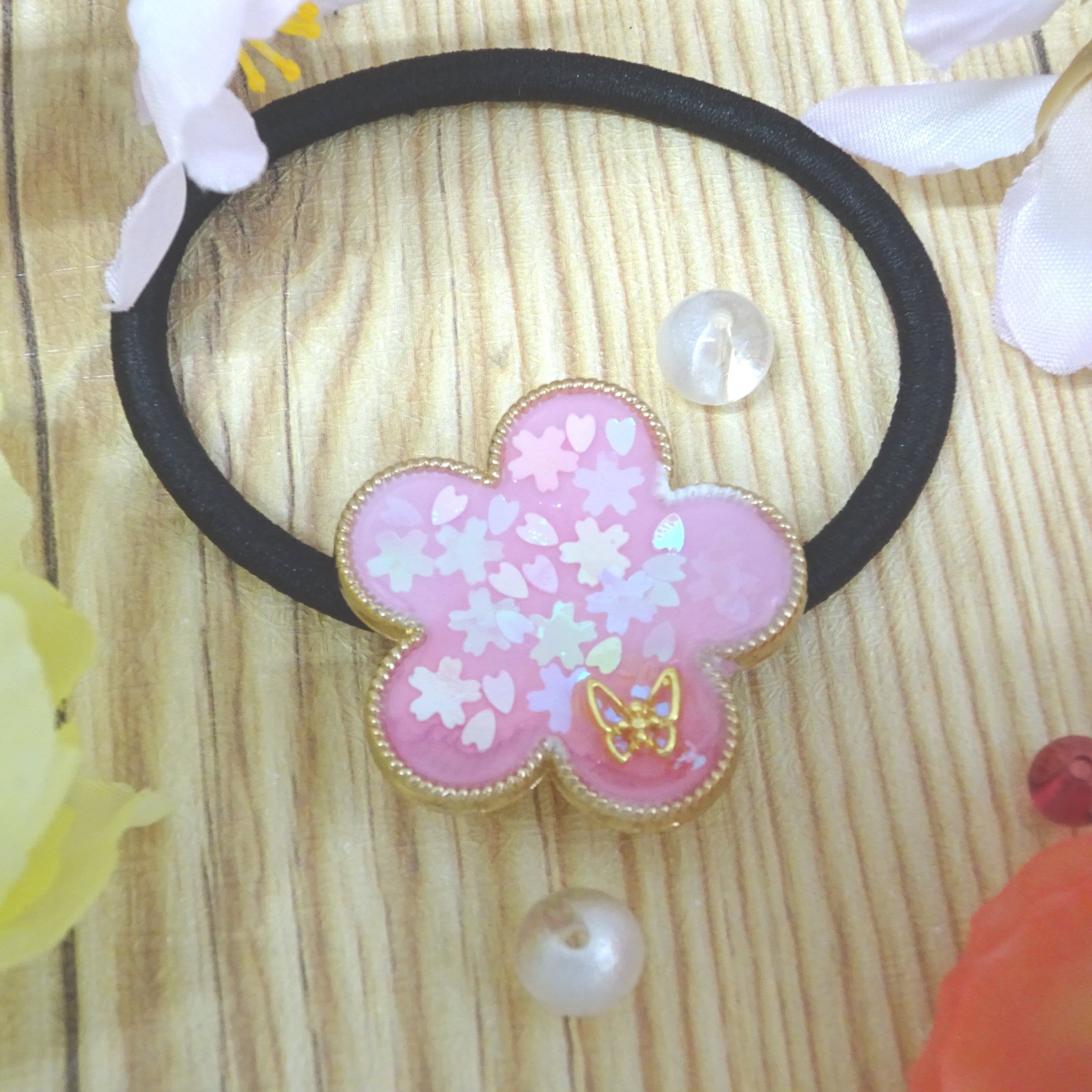 桜花ヘアゴム[レジン/一点もの/ヘアゴム/桜/花/蝶/キラキラ]